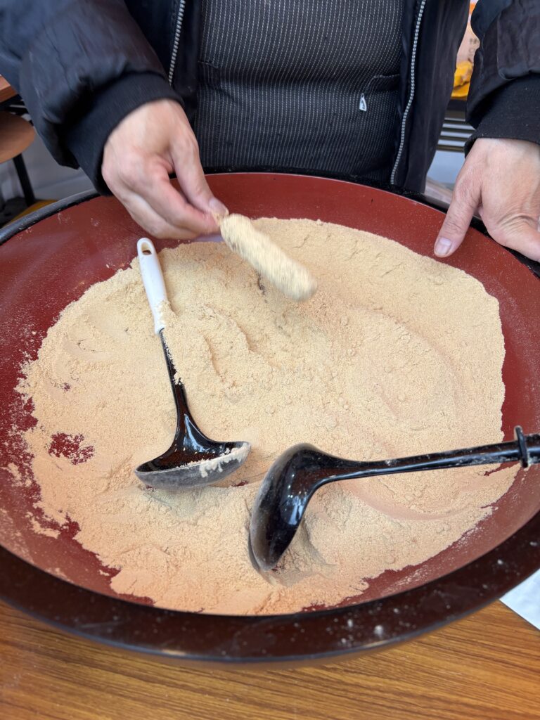 その場でお団子をゆでてくれて、あったかいキビ団子にきなこーー🤤